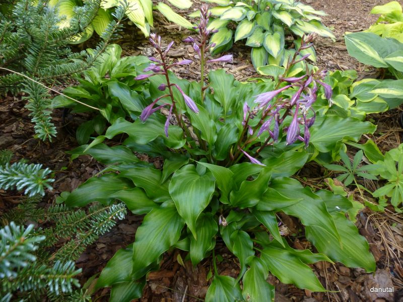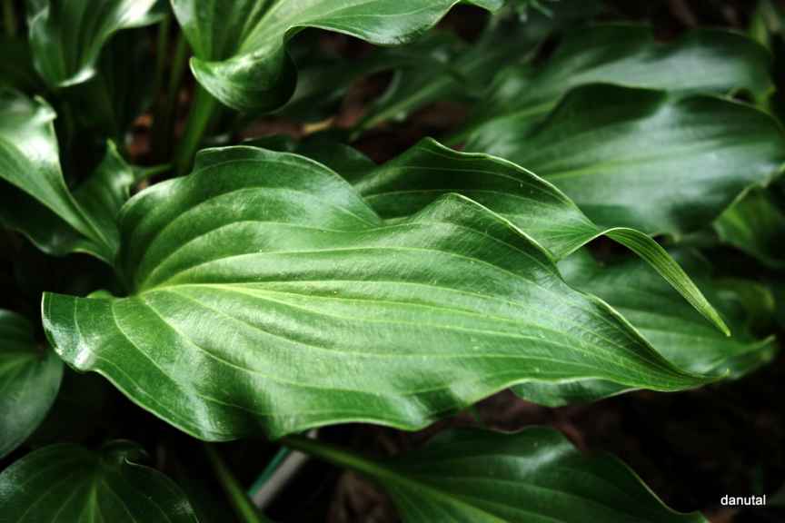 Rozmiar: M wysokość 35-40cm. Liście: ciemnozielone, mocno błyszczące, spiczaste, o pofalowanym brzegu i skręconym czubku Kwiaty: ciemno-lawendowe, prawie purpurowe na czerwono nakrapianych łodygach Zalecane stanowisko: od słońca do cienia Uwagi: