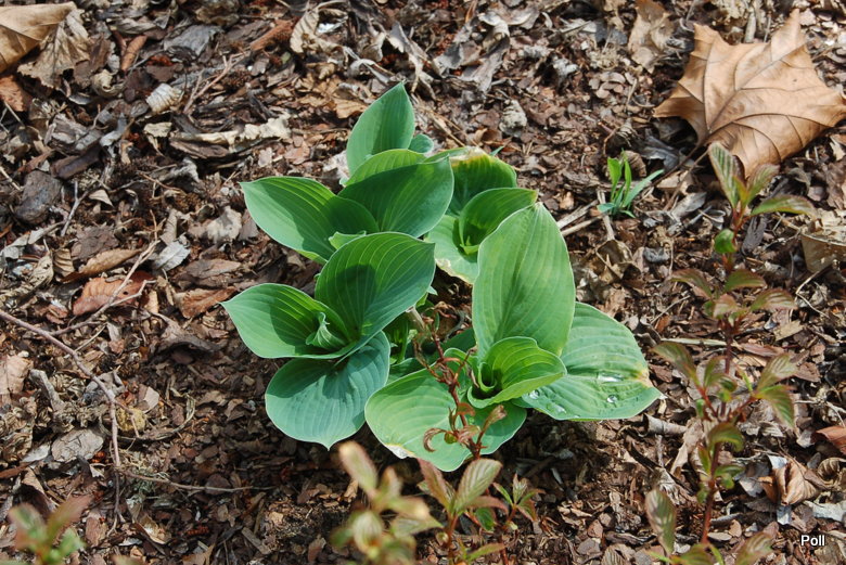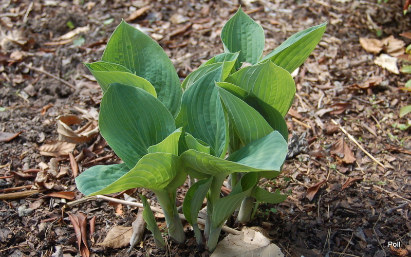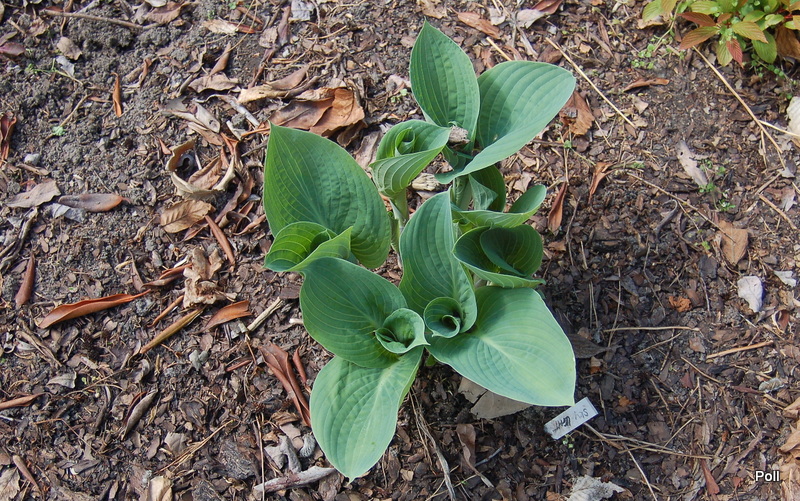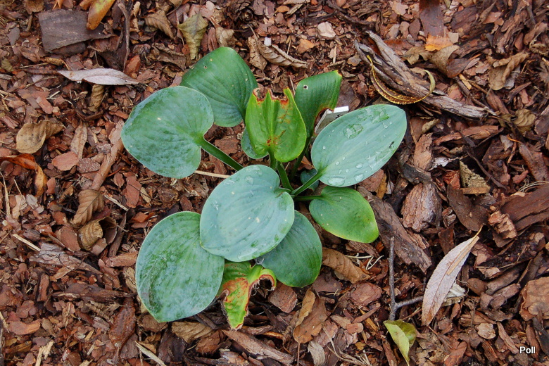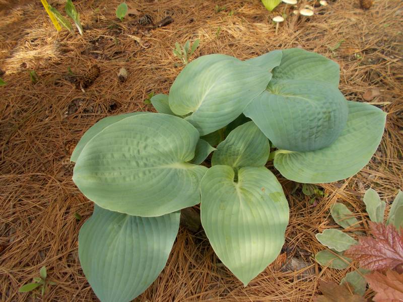 Liście: sercowatego kształtu, niezbyt olbrzymie (30 x 20 cm), ale mocnej substancji; czysto niebieskie, niemal barwy akwamaryny, wiosną matowe - pokryte błękitnym pudrem; u starszych roślin wyraźnie burchlaste
