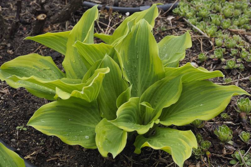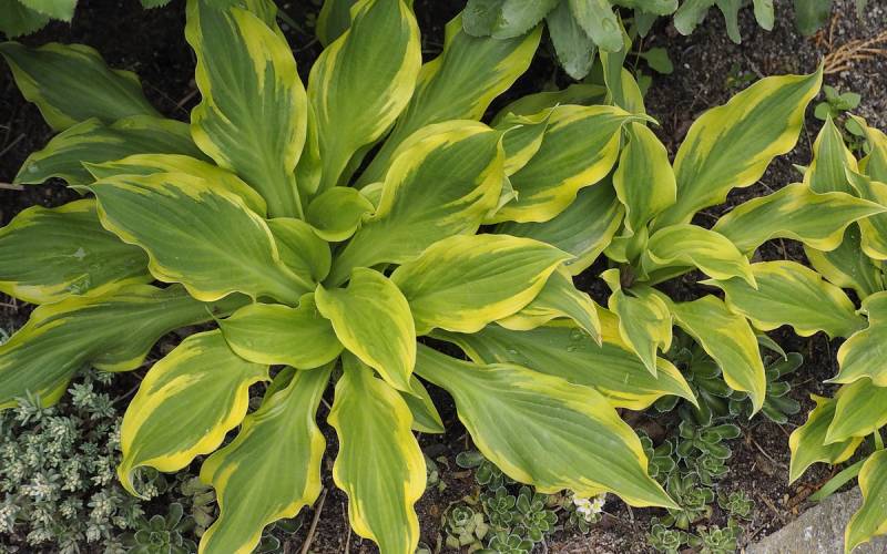 Liście: wydłużone, zielone z niezwykłym pomarańczowo-żółtym brzegiem, który zanika późnym latem; liście gęste i grube