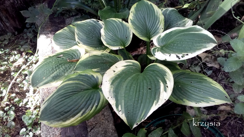 Rozmiar:L (wysokość około 60-65 cm) Liście: duże, karbowane, o zielononiebieskim środku i szerokim, złotym marginesem, Kwiaty: blado lawendowe pojawiają się w połowie lata (czerwiec/lipiec) Zalecane stanowisko: pół cieniste, cieniste