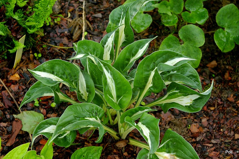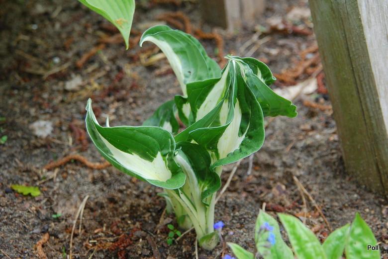 Liście: sercowate, mocno powykręcane, bardzo twarde i sterczące do góry, sprawiają wrażenie plastikowych; białe, nakrapiane na zielono centrum, z ciemnozielonym, szerokim marginesem