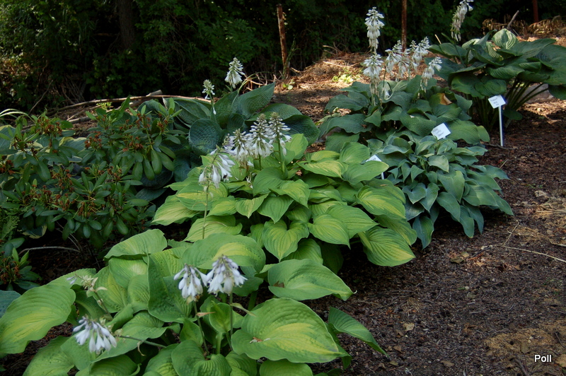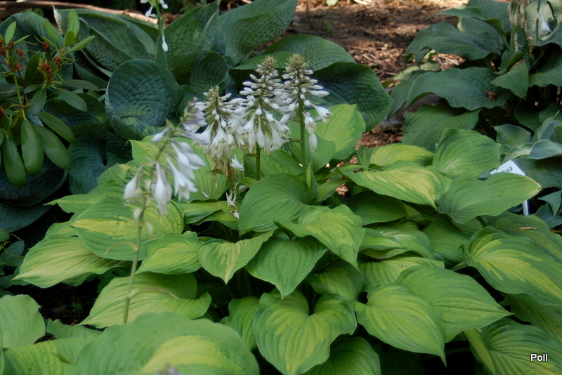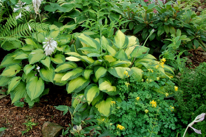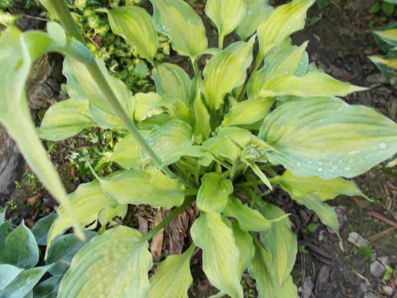 Wielkość - wysokość 60-65 cm Liście - żółte z szerokim zielonym marginesem , lekko falujące Kwiaty - jasno lawendowe Wzrost - średni Stanowisko - cień , półcień