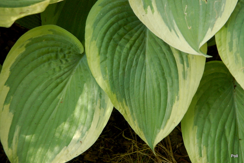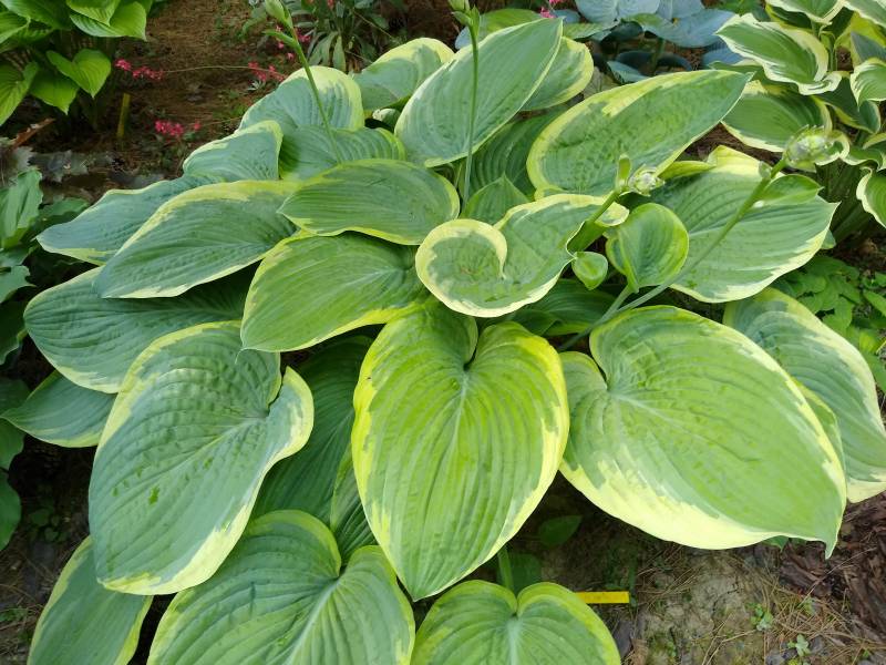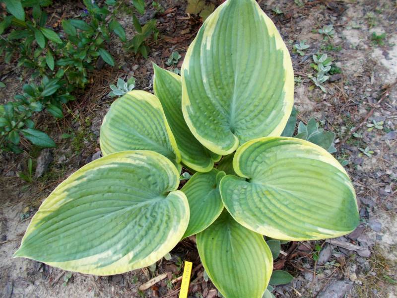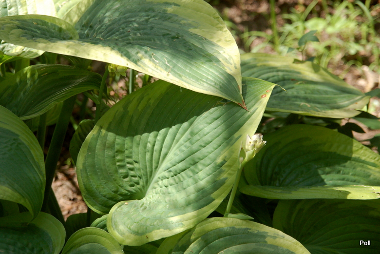 Rozmiar - L (wysokość 60 -70 cm ) Liście - - duże ,zielone , mocno pofałdowane , dobrej substancji , wiosną z żółtym marginesem , później kremowo -białym Kwiaty - prawie białe Stanowisko - cień , półcień Wzrost - średni
