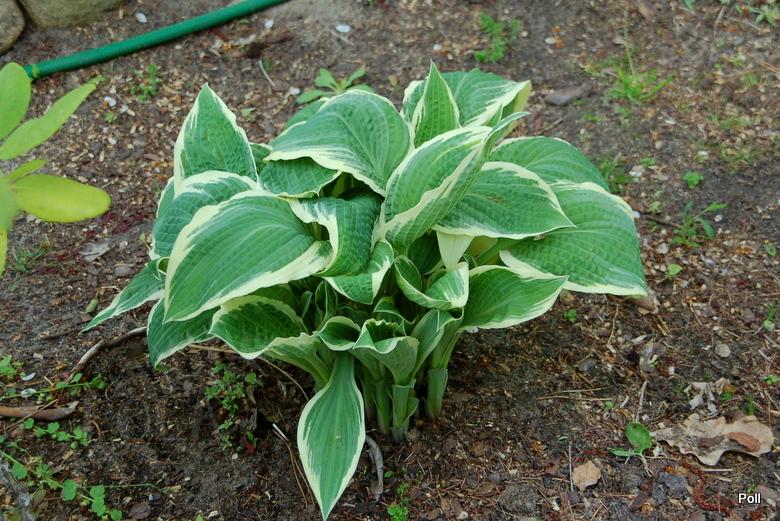 Hosta Wheaton Tunder , 5-ty rok na tym samym kiepskim, bo mocno suchym stanowisku. Miejsce jest dość słoneczne a ziemia bardzo szybko sie obsusza.