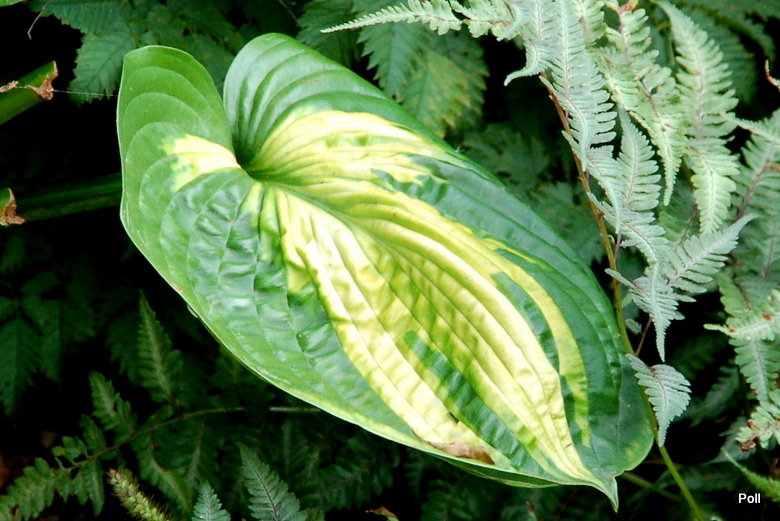 Liście: sercowato-okragłego kształtu, u starszych roślin układające się w miseczki, grube/dobrej substancji, mocno burchlaste; żółte centrum otoczone szerokim, nieregularnym marginesem, który wiosną jest niebieskozielony a w trakcie upływu sezonu staje się ciemnozielony