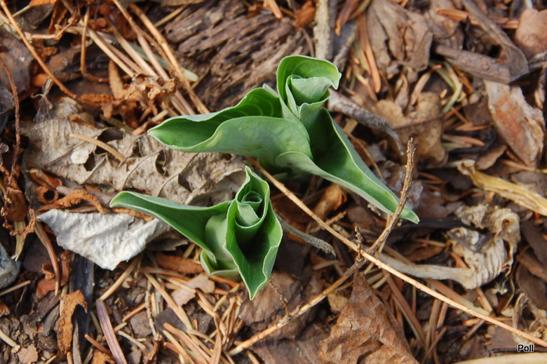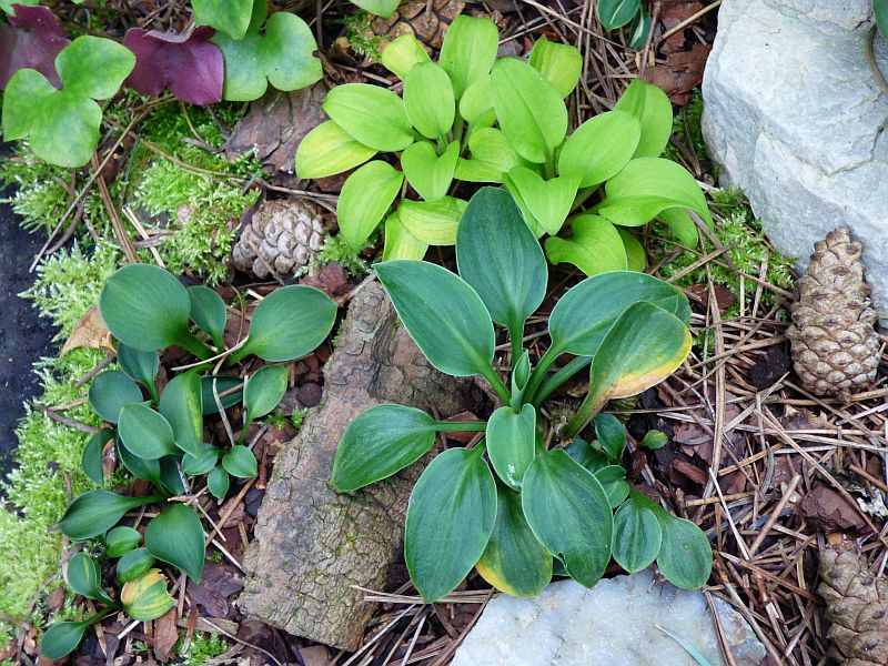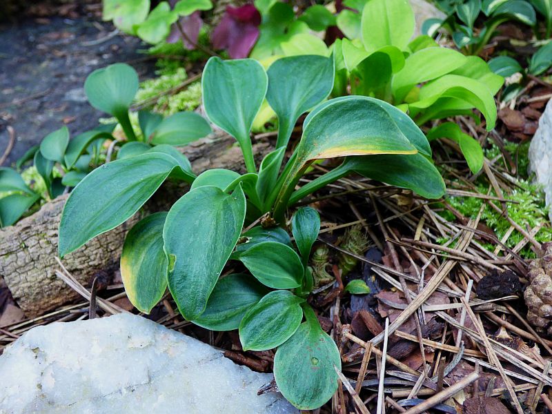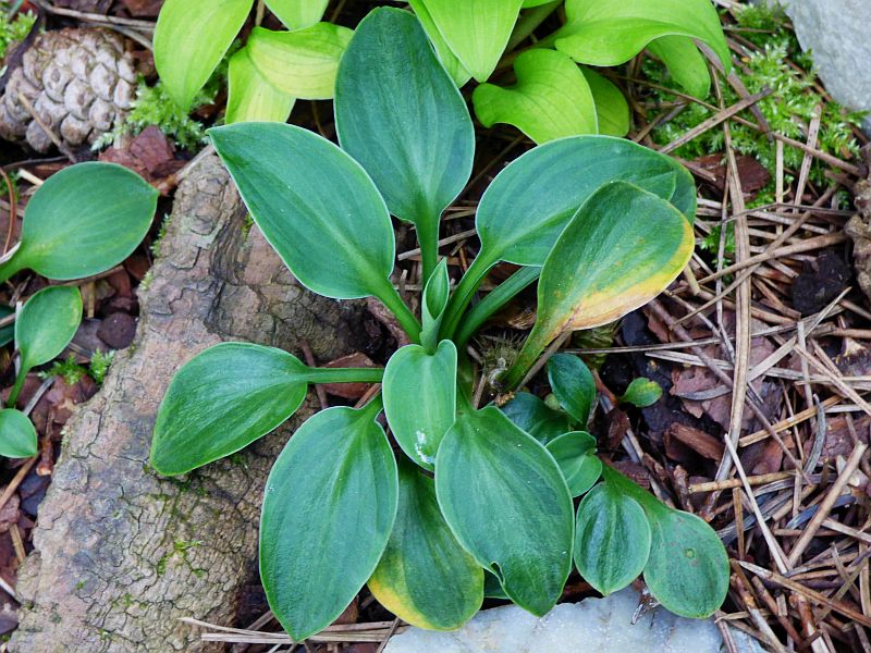 Liście: okrągłe, twarde... niebieskawe centrum z początkowo żółtawo zielonym, następnie zielonym marginesem