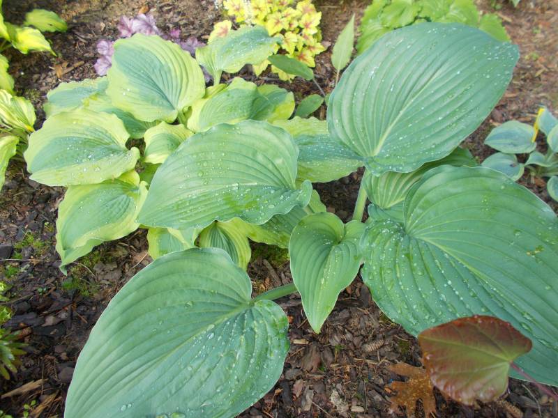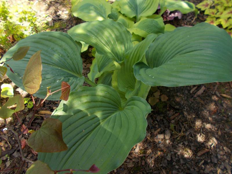 Rozmiar - L (wysokość 60-80cm.) Liście - zielone , błyszczące, podłużne, sercowato wklęśnięte przy ogonkach, wzniesione do góry, z wyraźnym żebrowaniem. Kwiaty - prawie białe z fioletowymi pylnikami, lekko pachnące, na wysokich łodygach , niezbyt dekoracyjne, kwitnie lipiec/sierpień. Stanowisko - od półcienia do cienia.
