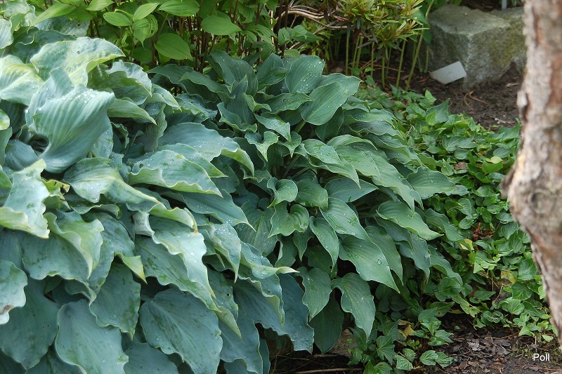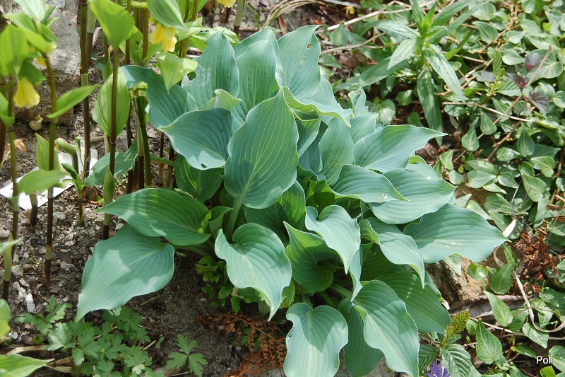 Liście: nieduże, o wymiarach 11x 6 cm, sercowato-podłużnego kształtu, nieco wzniesione sztywno ku górze i osadzone na nieco podczerwienionych ogonkach ; niebieskoszare, lekko falujące; wiosną pokryte puderem, sprawiającym wrażenie, że są matowe; spód liścia także przypudrowany