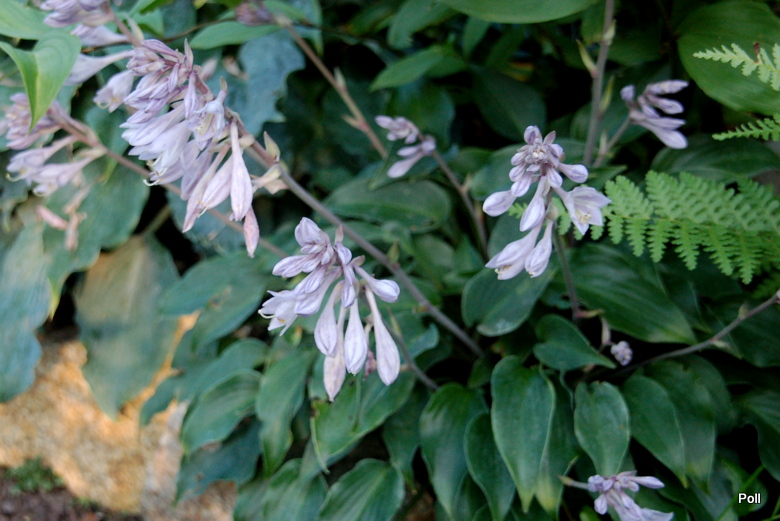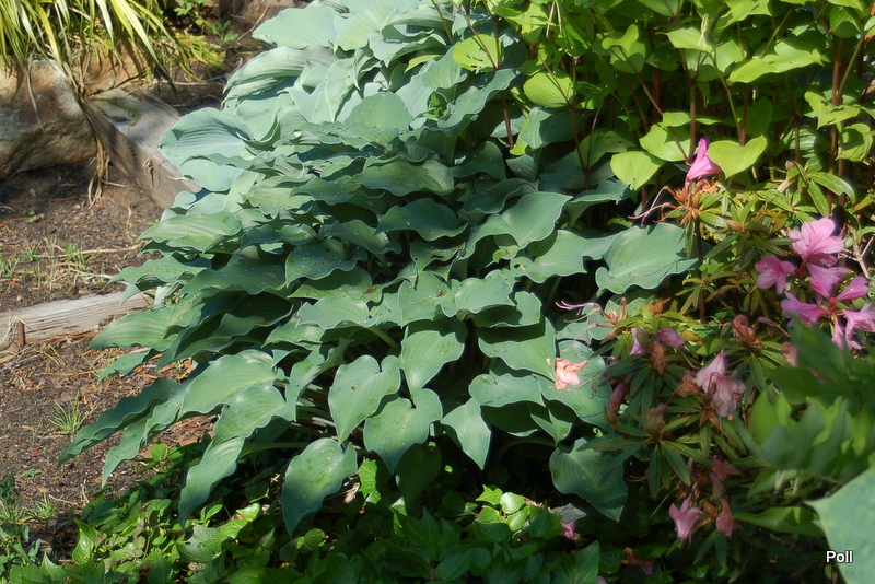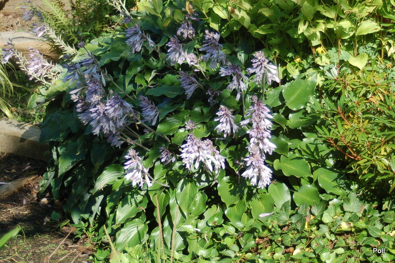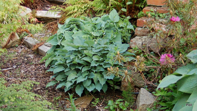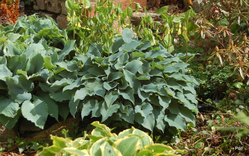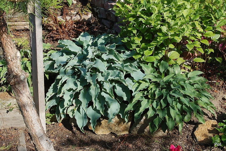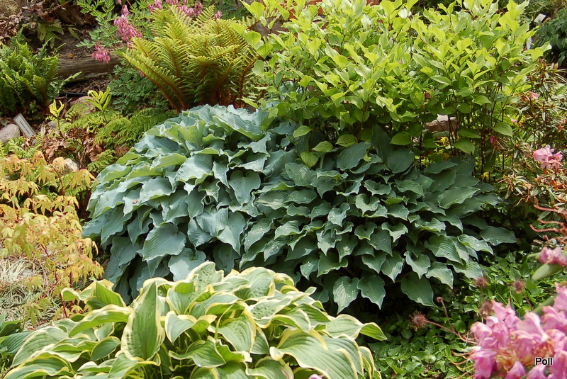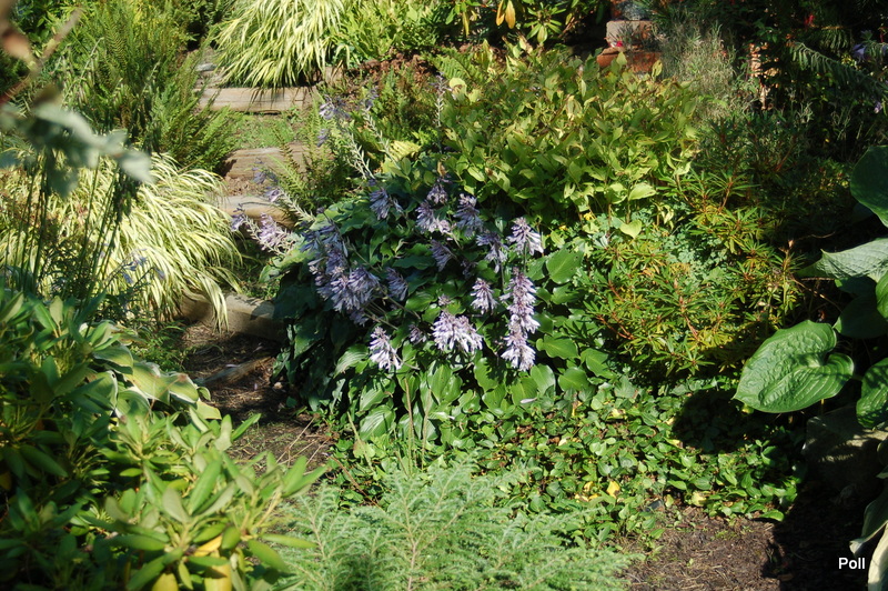 Bubbatini wsród innych roślin - w centrum niebieska hosta