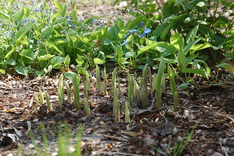 Rozmiar L wysokość 70cm Liście duże, zielone, mocno żebrowane, z delikatna falbaną na brzegu, dobrej substancji, sztywne. Kwiaty jasno-lawendowe, kwitną w lipcu Zalecane stanowisko cień do półcienia