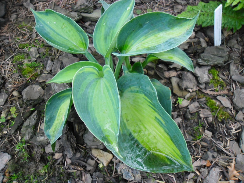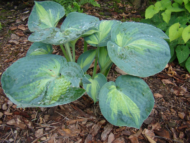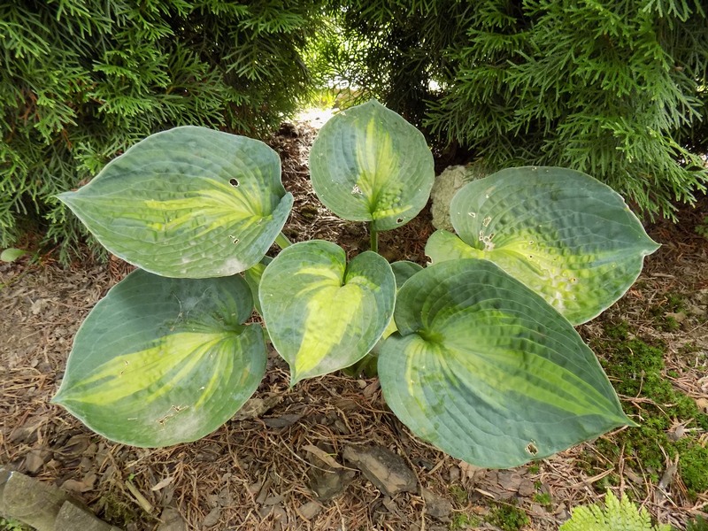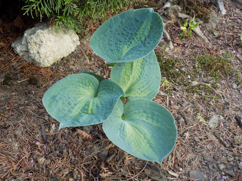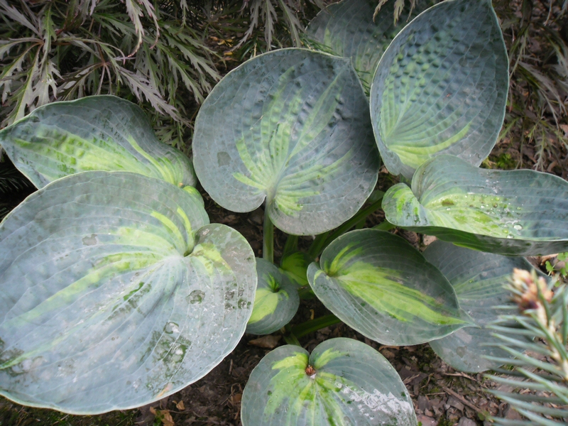 Liście burchlaste, masywne, ciężkie, osadzone na krótkich łodyżkach. Środek liścia seledynowy z szerokim sinoniebieskim, pudrowanym marginesem.