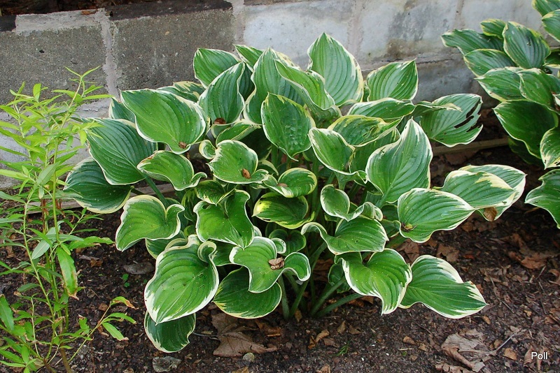 Liście szarozielone z falującym żóltym marginesem, który jaśnieje do kremowego w ciągu sezonu.