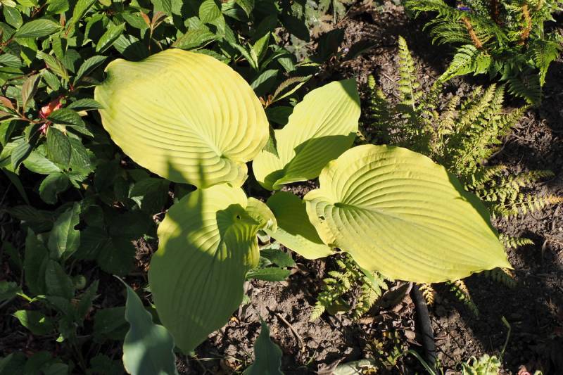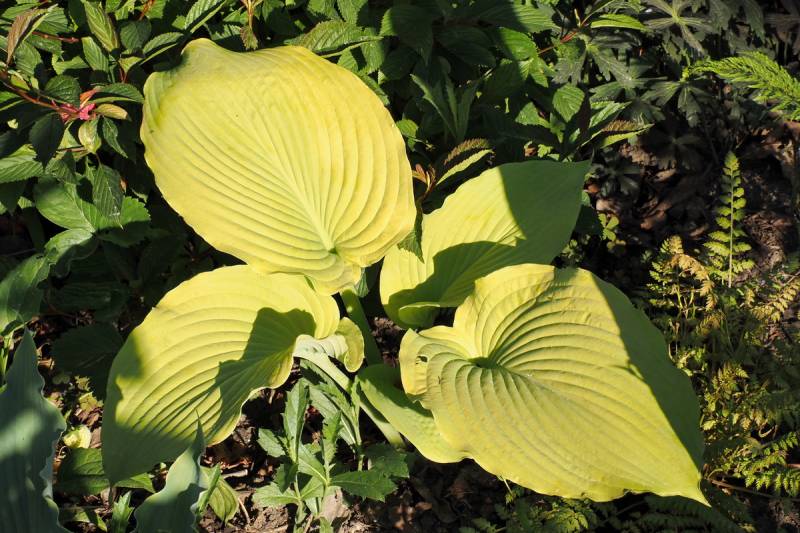 Liście duże, limonkowo zielone, wyraźnie żebrowane, lekko burchlaste lekko falowane brzegiem. W ciągu sezonu jaśnieją, do kremow-żółtych na jasnych stanowiskach.