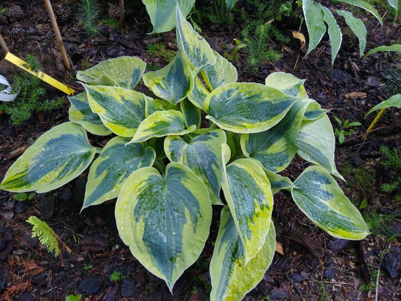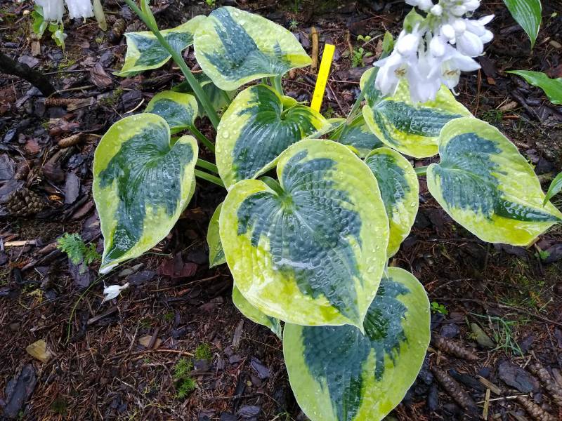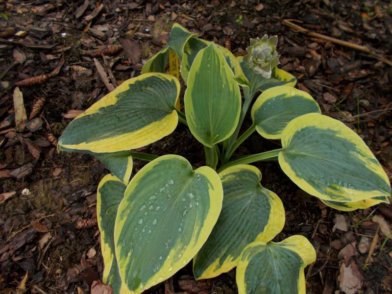 Rozmiar - M (wysokość 35-40 cm) Liście - dobrej substancji , niebieskie z szerokim żółtym marginesem Kwiaty - jasno lawendowe Wzrost - średni Stanowisko - cień , półcień