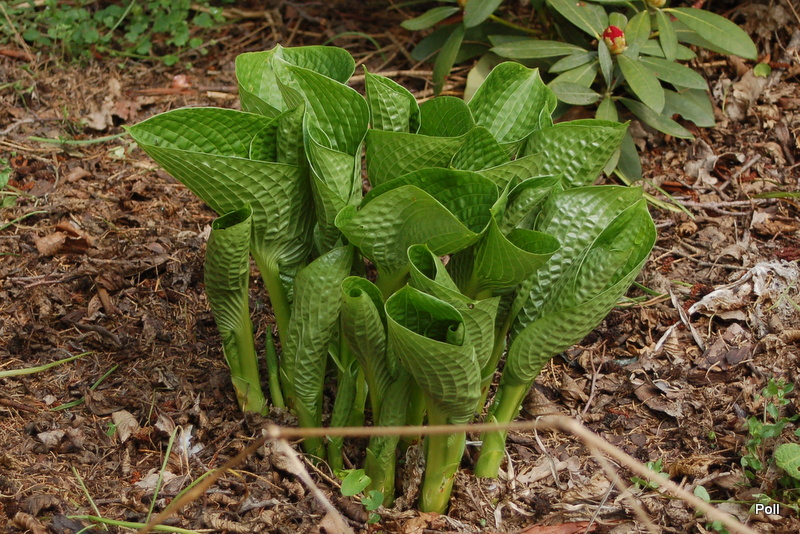 Rozmiar M/L wysokość 50-55 cm... wedle danych rejestracyjnych ma osiągać niemal 50 cm przy 100 cm szerokości Liście: ciemnozielone, okrągłe (23 x 22 cm), grube, mocno karbowane, bardzo błyszczące Kwiaty: bladolawendowe (VII) Zalecane stanowisko: słońce/cień