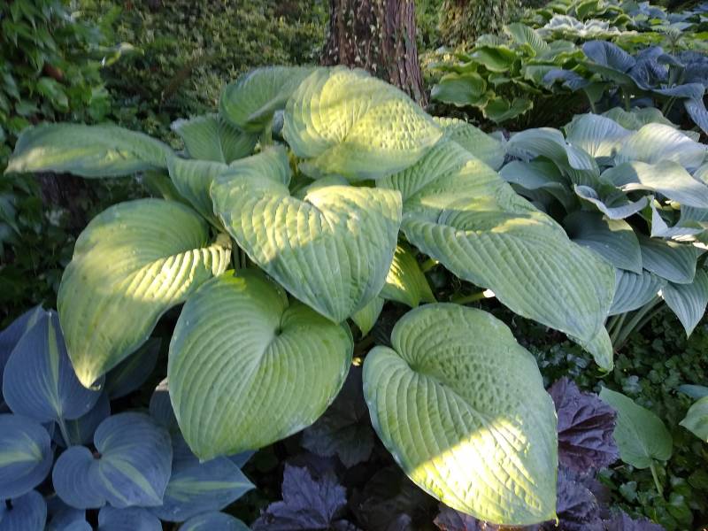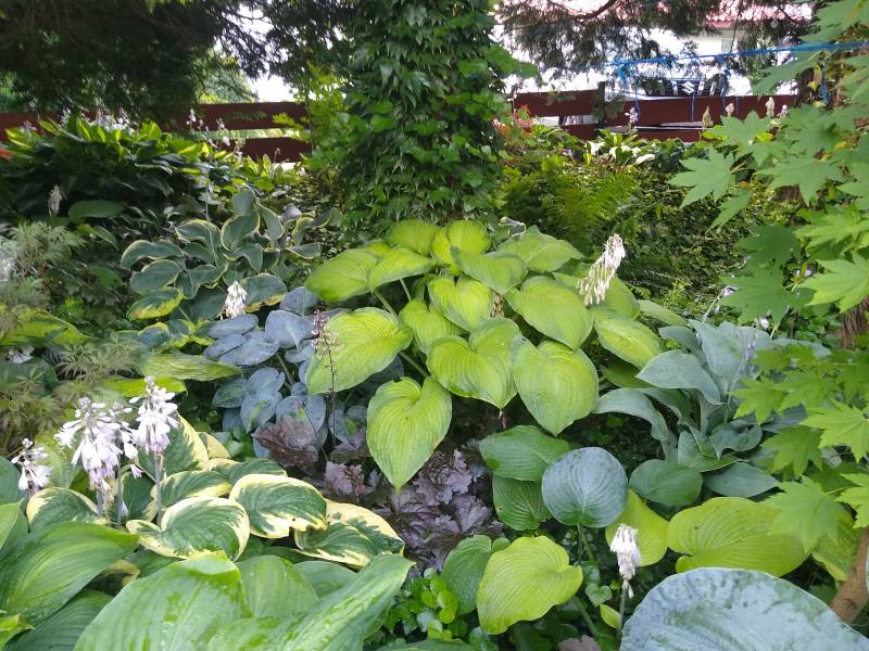 Rozmiar -L (wysokość 60-65 cm) Liście - jajowate, głęboko klapowane, i lekko faliste . Wiosną zielone , później jasno złote z zielonym marginesem Kwiaty - jasno lawendowe Stanowisko - cień , półcień Wzrost - powolny