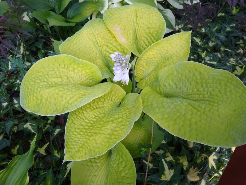 Rozmiar M (wysokość - do 45 cm Liście - mocno pofałdowane, szeroko jajowate , grubej substancji , żółtego koloru Kwiaty - prawie białe Stanowisko - cień , półcień Wzrost - średni
