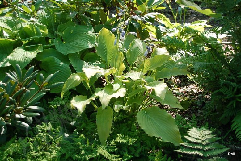 Rozmiar M wysokość 30-40 cm... wedle danych rejestracyjnych ma nie dorastać do 30 cm wzrostu przy niemal 40 cm szerokości Liście: wydłużone, ostro zakończone, o wymiarach około 18 x 9 cm... złotożółte z pofalowanym brzegiem i białym spodem... dobrej substancji Kwiaty: niemal białe (VII/VIII) Zalecane stanowisko: słońce/cień
