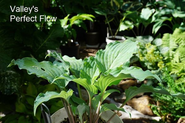 Rozmiar M Liście: podłużno sercowate... niebiesko zielone z mocno pofalowanym marginesem, dobrze widocznymi nerwami oraz białym spodem... osadzone na purpurowo czerwonych łodyżkach Kwiaty: lawendowe (VII/VIII) Zalecane stanowisko: pólcień/cień