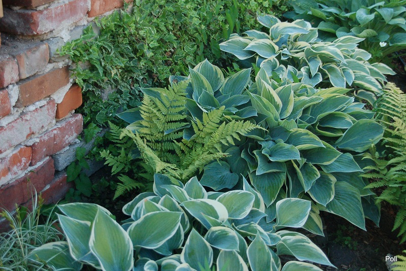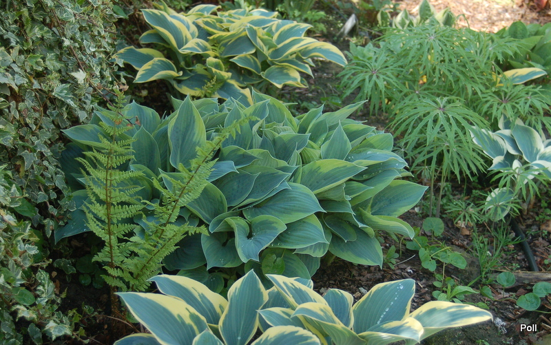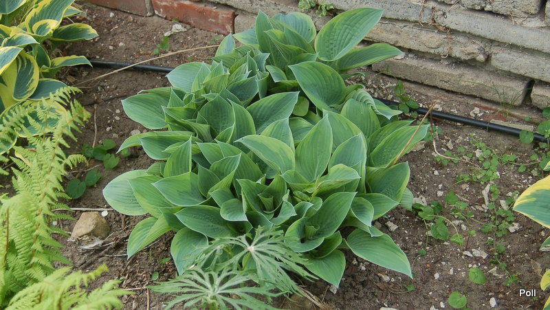 Rozmiar M wysokość 35-40 cm Liście: sercowate.. niebieskie z początkowo zielonkawo żółtym, następnie żółtym marginesem... dobrej substancji Kwiaty: lawendowe (VII/VIII) Zalecane stanowisko: pólcień/cień