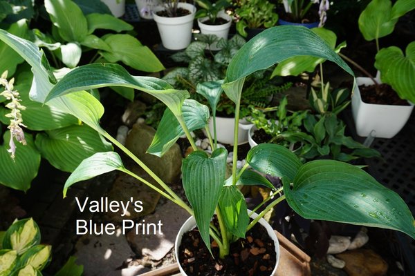 Rozmiar S/M wedle danych rejestracyjnych ma osiągać 25 cm (?) wysokości przy 35 cm szerokości Liście: podłużne, o wymiarach około 21 x 11 cm... intensywnie niebiesko zielone z dobrze widocznymi nerwami i białym spodem... lekko błyszczące z wierzchu i od spodu Kwiaty: niemal białe (VIII/IX) na 50 cm łodygach Zalecane stanowisko: pólcień/cień
