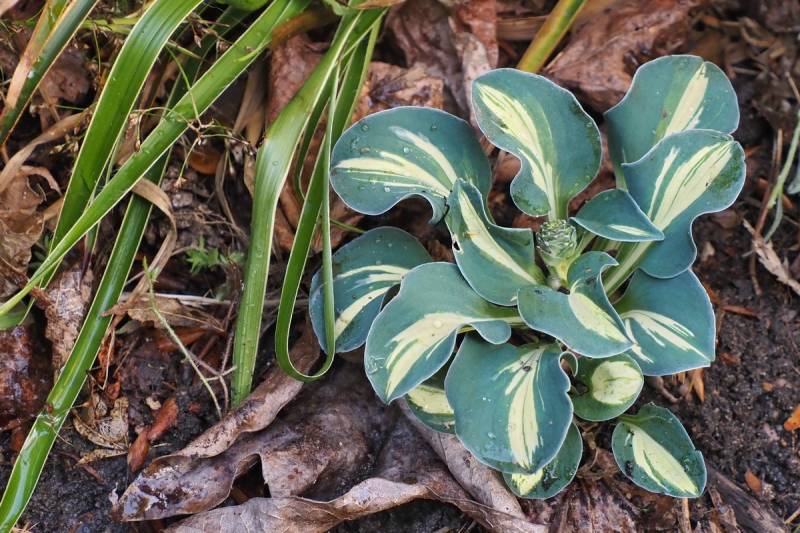 Liście: okrągłe, twarde... początkowo kremowo białe, szybko rozjaśniające się do czystej bieli centrum, częstokroć z zielonymi smużeniami i niebieskawo zielonym marginesem