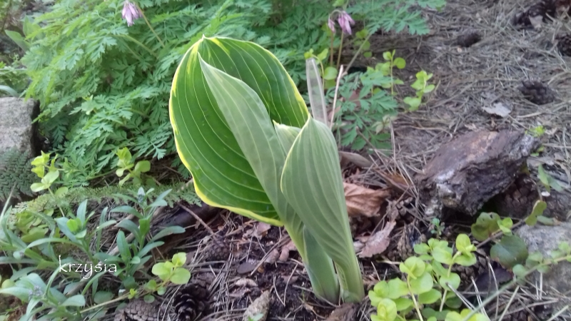 Hosta Sagae - zeszłoroczny zakup, dostała miejscówkę pod sosną, wiosną ma dość dużo słońca, dopóki winogrono sąsiada nie wypuści liści.