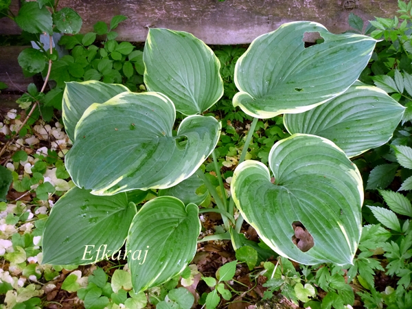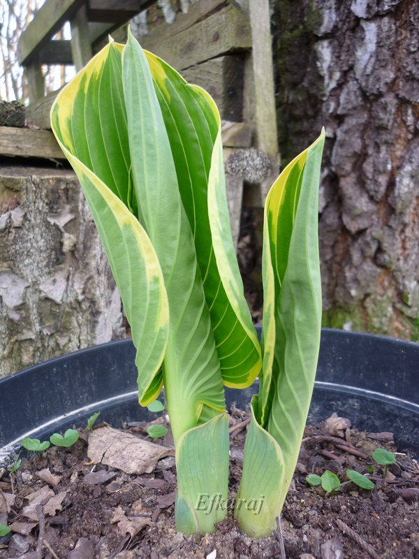 Polu, może jest to spowodowane jej zimowaniem? Nigdy wcześniej nie zimowałam host w doniczkach, wszystkie były zadołowane na stałych miejscach w ziemi. Sagae jesienią przesadziłam do donic, ze względu na nornice. Jedną część zadołowałam i ona ma dopiero ledwo wystające kły. Ta ze zdjęcia była w luźno stojącej donicy. Zimą stała przy południowej ścianie domu, przykryta gruba warstwą liści. Gdy ją odkryłam, ruszyła z kopyta jako pierwsza. Chyba miała "wygrzane" nóżki :lol: