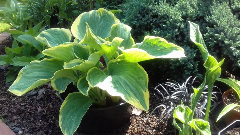 Hosta z podziału, zimę spędziła w doniczce, w której nadal rośnie, ma trochę słońca w południe