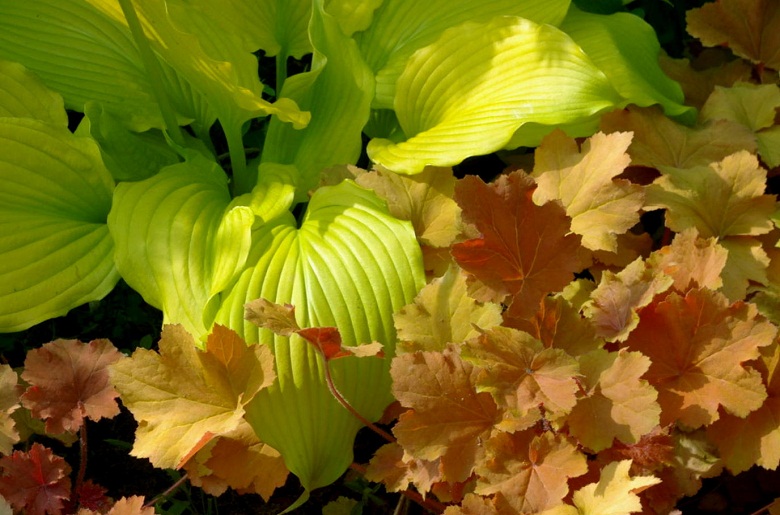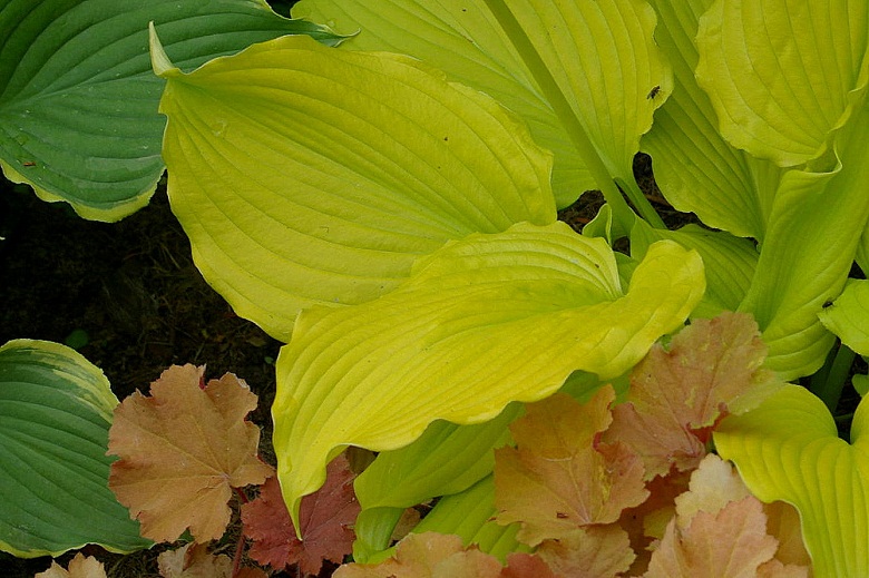 Liście: duże, mocno unerwione, z pofalowanym brzegiem; wiosną bardzo jaskrawe żółto-kremowe, w sezonie minimalnie zielenieją;