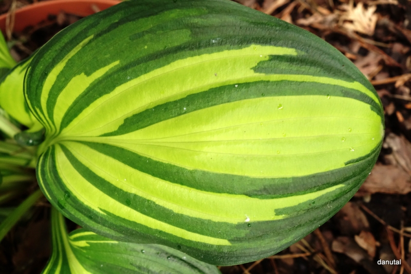 - przez charakterystyczne paski i prążki na liściu, upodabnia się do host typu streaked