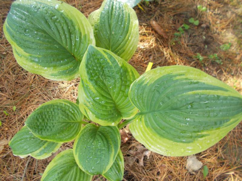 Rozmiar L (wys/szer 55 / 80 cm) Liście - ciemno zielone ze złoto żółtym szerokim, nieregularnym marginesem Kwiaty - lawendowe Stanowisko - cień , półcień Wzrost - średni