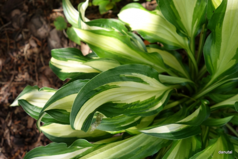 Rozmiar: S wysokość 15-25cm Liście: długie,lancetowate, poskręcane, spiczasto zakończone, lekko błyszczące; biało-kremowe centrum z zielonym, lekko pofalowanym,nieregularnym marginesem Kwiaty: jasno-lawendowe z purpurowymi paskami w sierpniu na ulistnionych łodygach Zalecane stanowisko: półcień do cienia