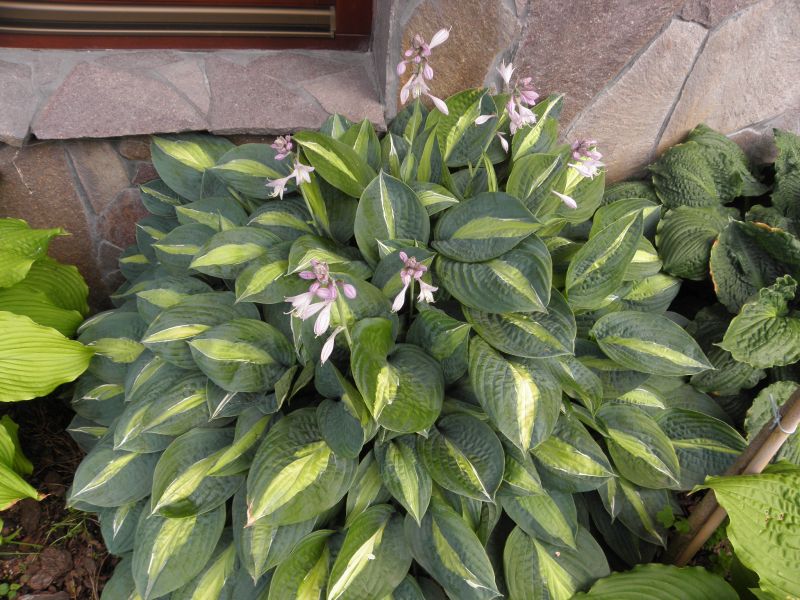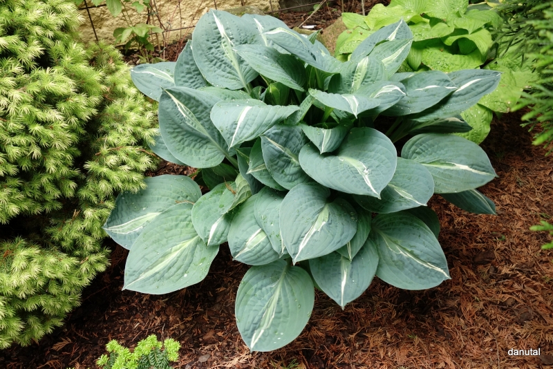 Liście: dobrej substancji,niebiesko-zielone z żółtym centrum oddzielonym od marginesu śnieżno białą "nitką" ;centrum liścia początkowo zielonkawe pod koniec sezonu staje się złoto-żółte.