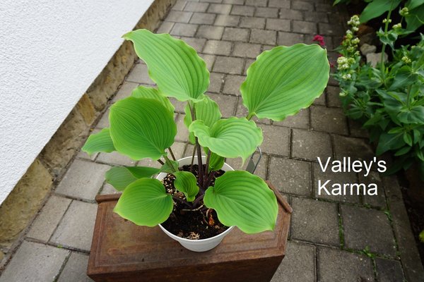 Rozmiar M (?) Liście: sercowate... niebieskawo zielone z mocno pofalowanym marginesem, wyraźnie zaznaczonymi nerwami i białym spodem... osadzone na długich, purpurowo czerwonych łodyżkach Kwiaty: lawendowe Zalecane stanowisko: pólcień/cień