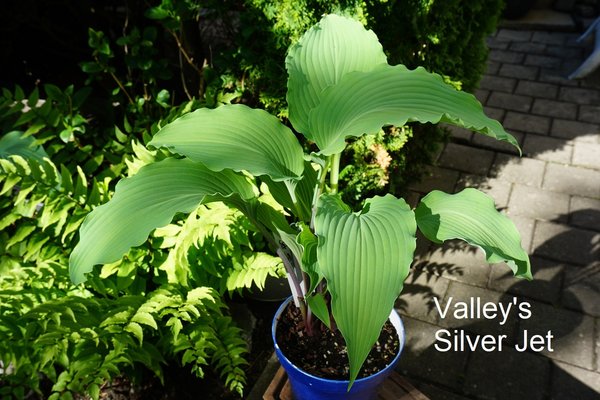 Rozmiar M Liście: podłużno sercowate... początkowo zielone, potem łapie niebieskawe tony... z mocno pofalowanym marginesem, wyraźnie zaznaczonymi nerwami oraz białym spodem... osadzone na purpurowych łodyżkach Kwiaty: bladolawendowe Zalecane stanowisko: pólcień/cień