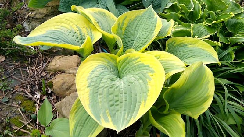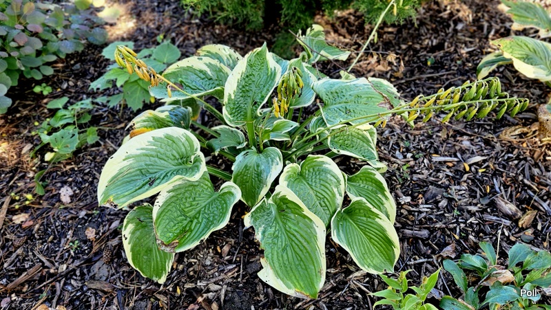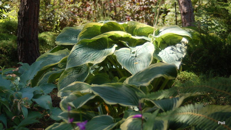 Wielkość - L (80-90 cm) Liście - duże , niebiesko zielone z żółtym marginesem Kwiaty - jasnolawendowe Wzrost - średni Stanowisko - cień , półcień