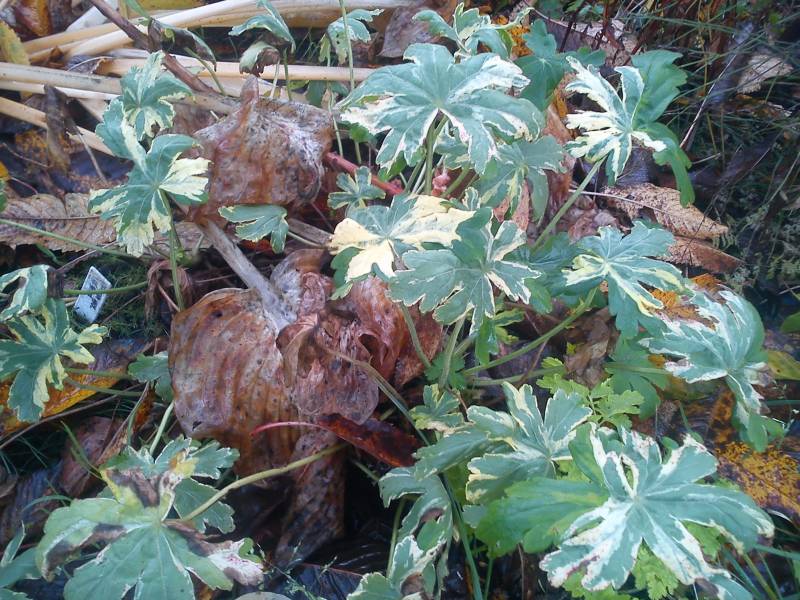 Późną jesienią, gdy szykowałam nowe rabaty paprociowe, podebrałam kilka sadzonek bodziszka 'Variegatum'. Trochę się obawiałam, czy nie za późno, bo niedługo potem zaczęły nas nękać niskie nocne temperatury, ale nie... Wszystkie sadzonki się przyjęły i tuż przed ochłodzeniem pokazały młode liście.