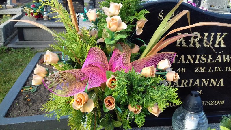 U nas kwiatami na grobowiec zajmuje się moja mama, która ma dar florystyczny. Niestety, szukam i szukam i zdjęć nie ma. Jedno tylko z ubiegłego roku. Również u nas nie ma typowych cmentarnych wiązanek.