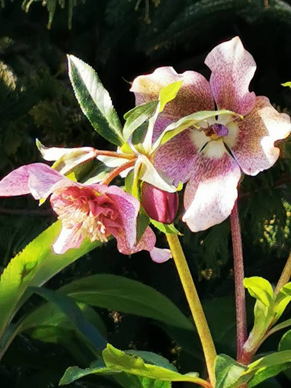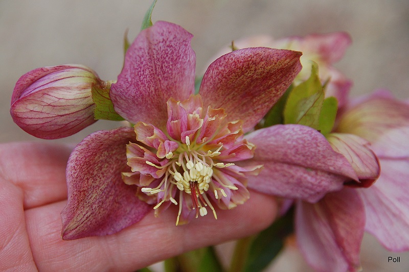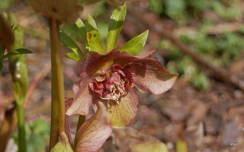 Oprócz zwykłych płatków, jakie posiadają pojedyncze kwiaty ciemierników, posiada on również podwójny pomarszczony kołnierzyk, czy też kryzkę, która otacza centrum kwiatu. Choć- upraszczając- pisze się, iż kwiaty te są różowe, to gdy przyjrzymy się, widzimy, iż kolor różowy jest tylko tłem dla ciemniejszych, niemal bordowych cętek pokrywających cała powierzchnię płatków. W późniejszym czasie tło jaśnieje i staje się beżowozielone, co jeszcze bardziej uwidacznia ciemniejszy wzór. Okres kwitnienia w naszych warunkach klimatycznych przypada na marzec/ kwiecień.