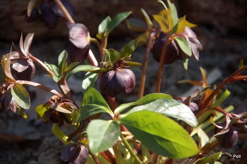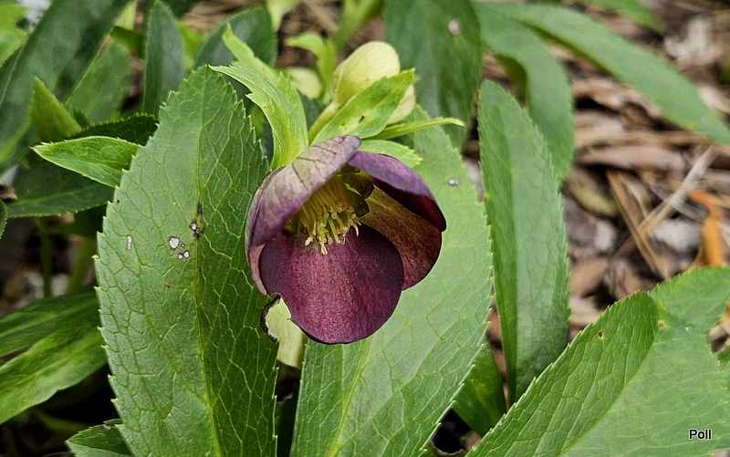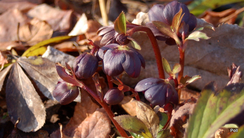 Helleborus x 'Naomi' już kwitnie, a ja jeszcze nie usunęłam liści platana, którymi jest zasypany: