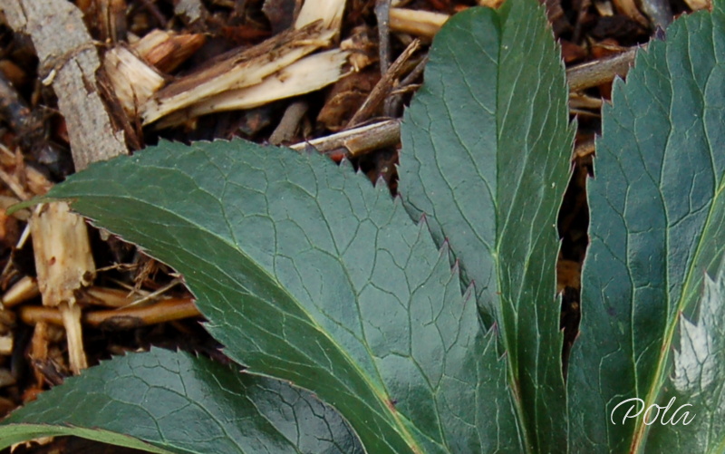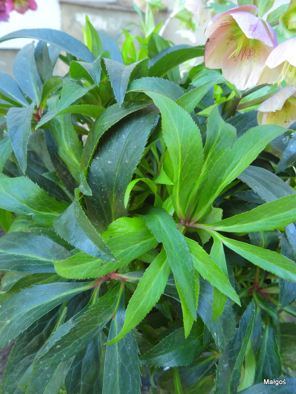 tworzy wysokie na około 50-55 cm kępy, złożone z błyszczących, ciemnozielonych i piłkowanych liści. Jak pisałam, do złudzenia przypominają one liście ciemierników wschodnich, ale są ciemniejsze, mają niespotykaną u tego gatunku czerwoną nasadę i ogólnie są większej urody.