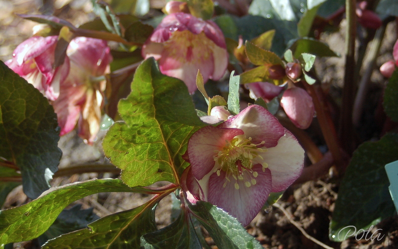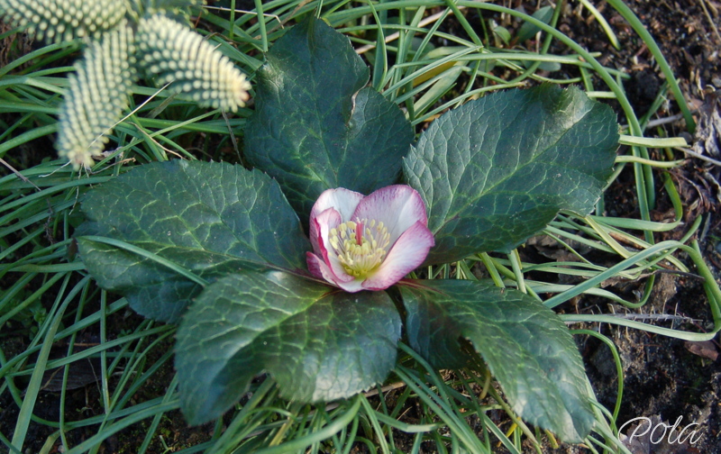 osiągać ma wysokość 30-35 cm. Liście są ciemnozielone i błyszczące a dodatkowo mają jasne przebarwienia wzdłuż nerwów, czym przypominają brytyjskie odmiany z serii 'Frostkiss' Rodney Davey Marbled Group. Kwiaty osadzone są na sztywnych, wyprostowanych łodygach i nie zwisają - rozwijają się na wprost, co ułatwia ich podziwianie. Białe płatki otoczone są po brzegach fioletowym, lekko rozlewającym się marginesem. Znalazłam informację, iż kwitnienie 'Macy Marble' ma się rozpoczynać już w grudniu i trwać do kwietnia, jednak o terminie kwitnienia w polskich ogrodach dowiemy się dopiero w przyszłym sezonie. Podejrzewam, że będzie to luty. Ciemierniki iburgskie nie zawiązują nasion.