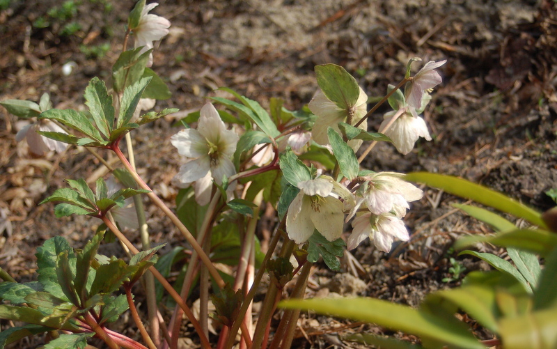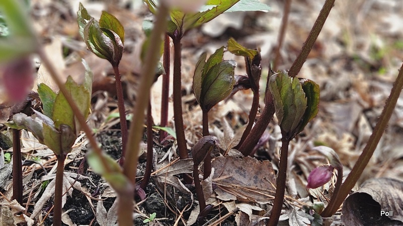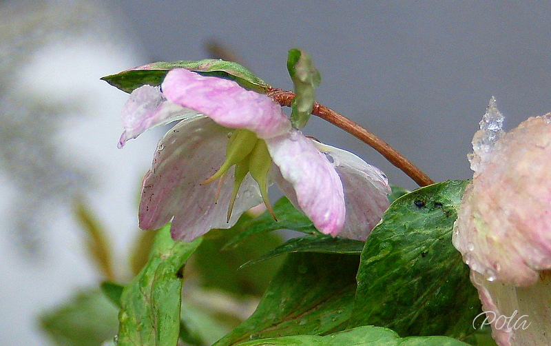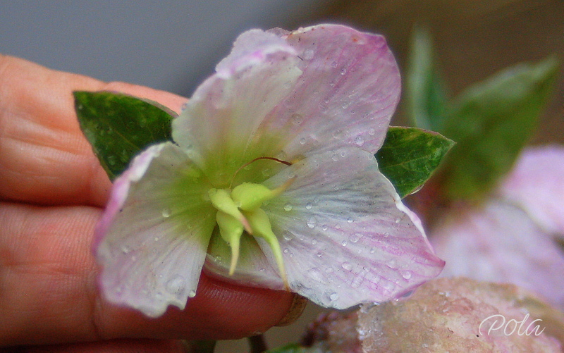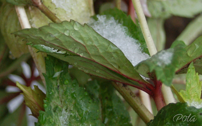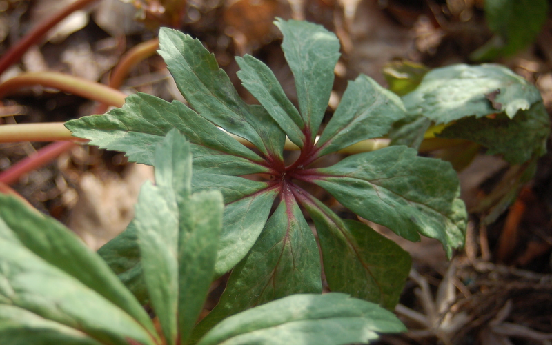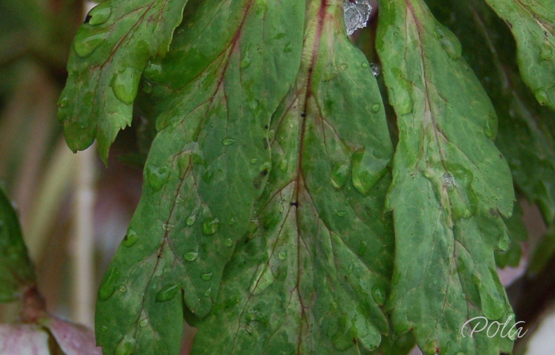Dicarpon. Jak pamiętamy... albo i nie... sekcja ta obejmuje tylko jeden gatunek tworzący dwa połączone owocolistki zawierające nasiona. Liście natomiast są jakby wypadkową obu gatunków - rodziców: mają miękkość liści ciemiernika tybetańskiego, ale ich kształt jest bardziej podobny do liści ciemiernika białego. Cudownie przebarwione - żywo zielone ze srebrnymi i różowymi refleksami, są jednymi z najpiękniejszych, jakie widziałam u rodzaju