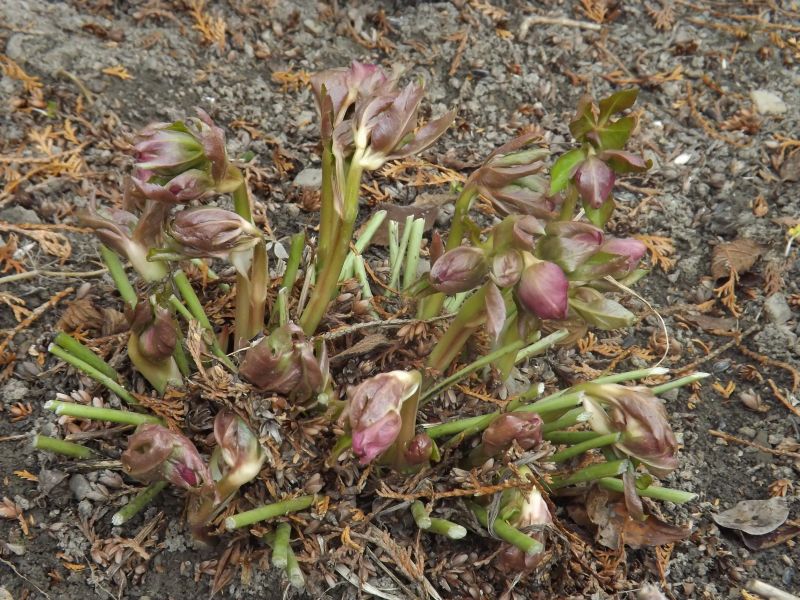 Ciemiernik (Helleborus x) 'White Beauty' wygląda niezbyt ciekawie bez liści i z nierozwiniętymi pąkami krecigl