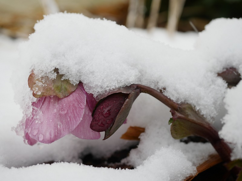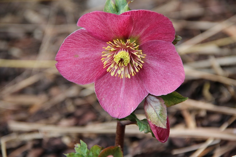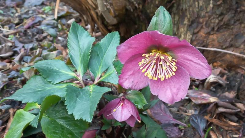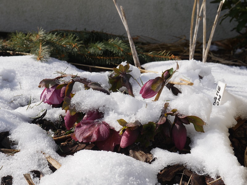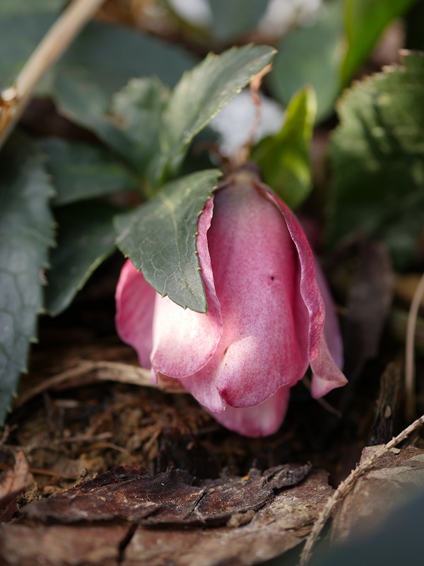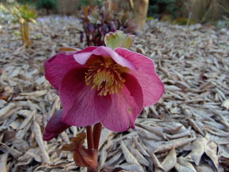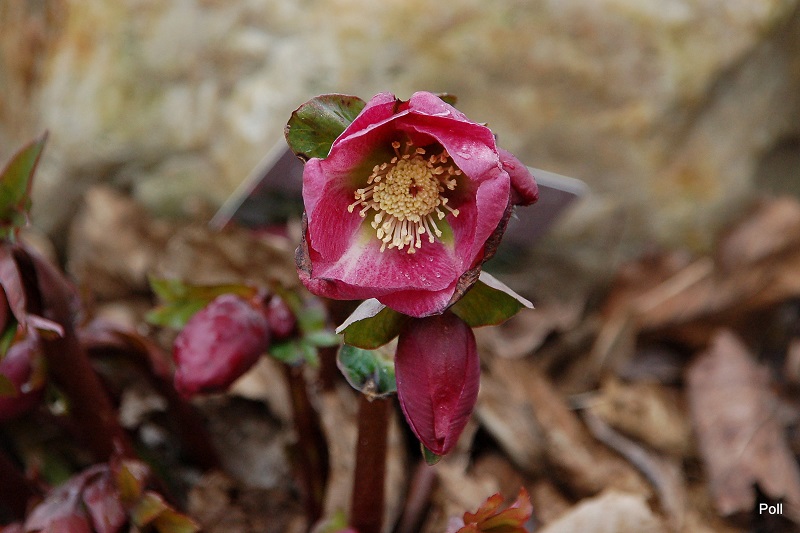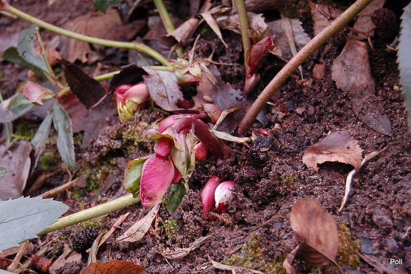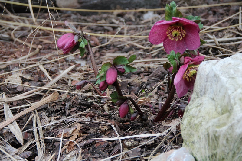Jeden kwiat niemal rozwinięty, reszta czai się w pąkach przy ziemi. W tym roku pogoda nie rozpieszcza ciemierników
