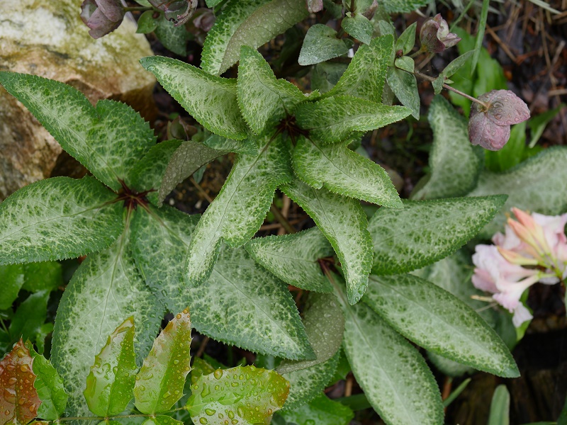 'Dorothy's Dawn' - oprócz ładnych kwiatów - ma piękne, marmurkowe liście. Niestety tak jak rodzic,