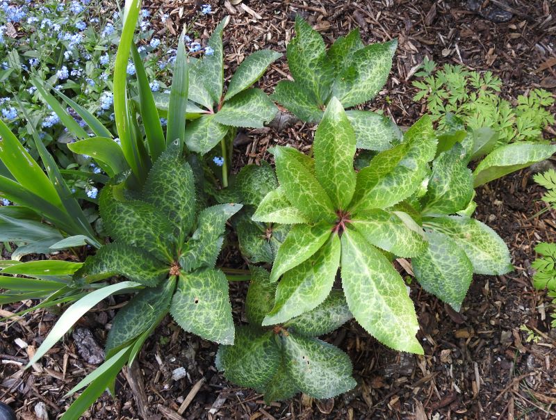 mostly) sterylne. Tak więc 'Glenda Gloss' to sterylny mieszaniec międzygatunkowy, uzyskany pod roboczym symbolem 'RD25' i zaliczany do serii Rodney Davey Hellebore Collection. Wszystkie ciemierniki z tej kolekcji odznaczają się urodą nie tyle kwiatów, która i tak trwa dość krótko, ale ciemnozielonych liści o spektakularnym jaśniejszym rysunku. O takich liściach mawia się potocznie, że są 'marmurkowe' i faktycznie liście 'Glenda's Gloss' w trakcie sezonu - od wiosny do jesieni - przybierają te najpiękniejsze barwy. Dojrzała kępa dorastających do 60 cm wysokości liści robi wielkie wrażenie i jest prawdziwą ozdobą ogrodu.