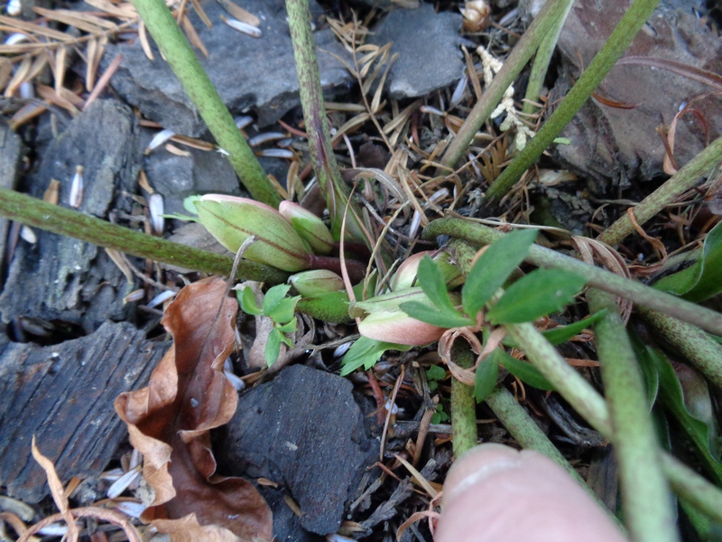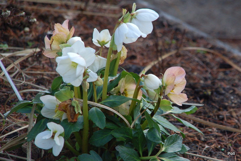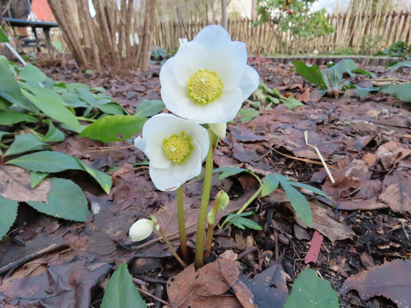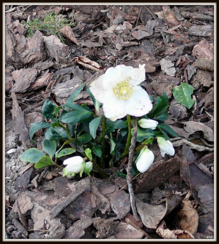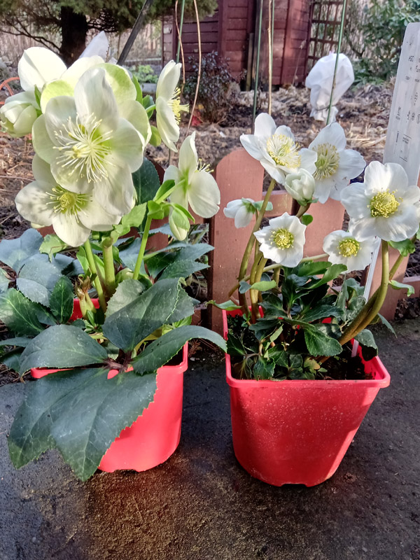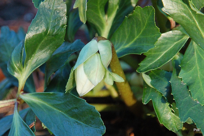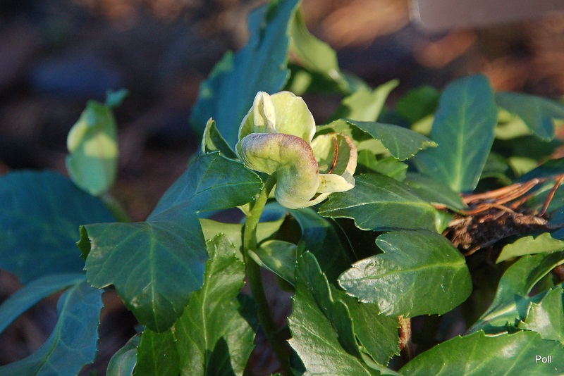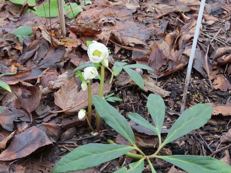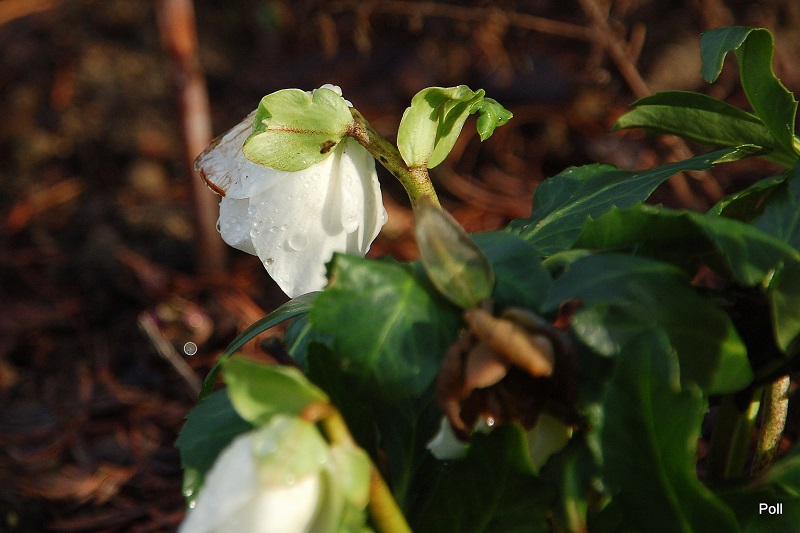 Ciemiernik biały 'HGC® Wintergold' rośnie na dość słonecznej rabacie, ale teraz dociera tam niewiele promieni słonecznych. Dziś zauważyłam, że wypuszcza prawidłowe pąki a pierwszy, nieco zniekształcony kwiat już zzieleniał.
