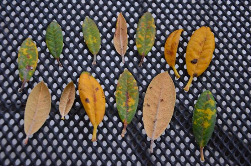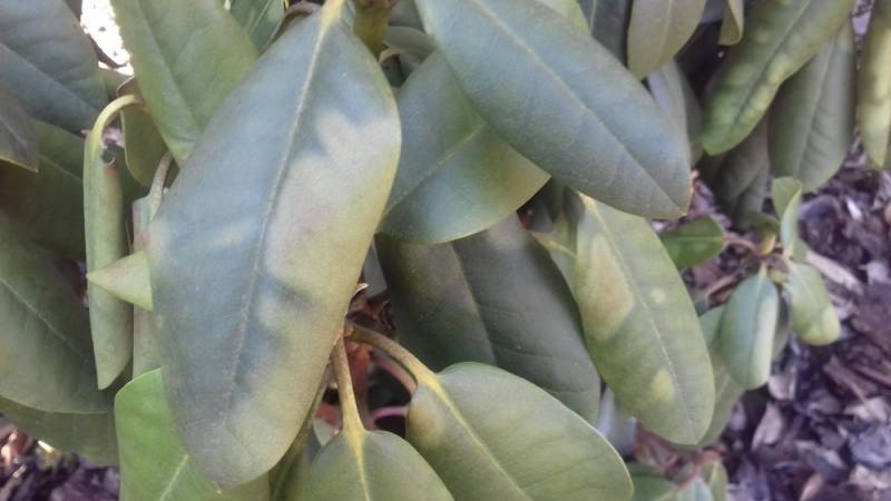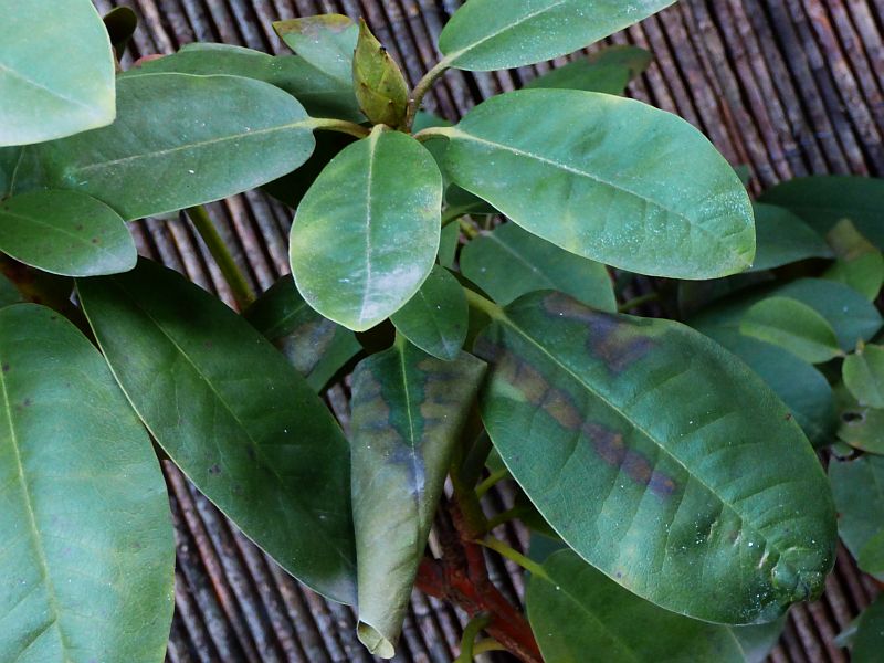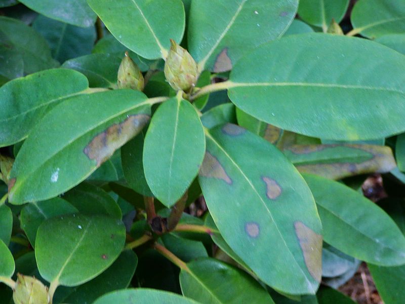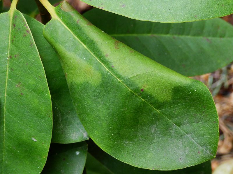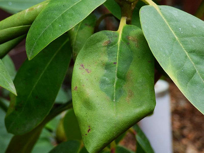 Jeden z moich mieszańców yakushimanum ma takie plamy na jednym z liści. Podejrzewam, że przyczyną jest niedostatek słońca. Z tego, co zaobserwowałem u siebie, hybrydy yakushimanym potrzebują trochę wystawienia na słońce. Jeżeli go nie dostają, pojawiają się infekcje grzybowe i najpóźniej jesienią liście z danego sezonu stają się brzydkie.